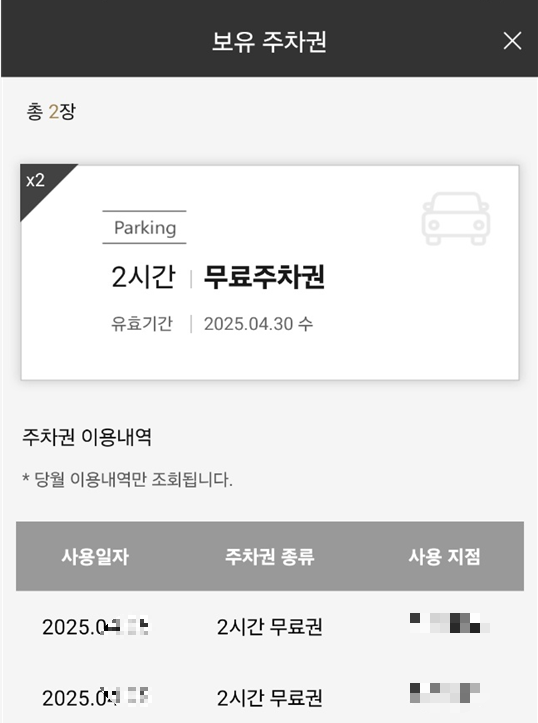 - 발급받은 주차권은 '나의 혜택' 또는 '마이페이지'에서 확인 가능