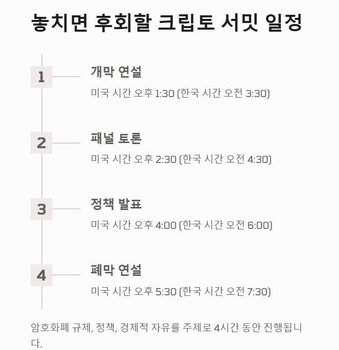 서밋은 미국 동부 시간 기준으로 오후 1시 30분부터 5시 30분까지, 한국 시간으로는 3월 8일 오전 3시 30분부터 7시 30분까지 진행됩니다. 총 4시간 동안 암호화폐의 규제, 정책, 경제적 자유를 주제로 심도 있는 논의가 펼쳐질 예정입니다.