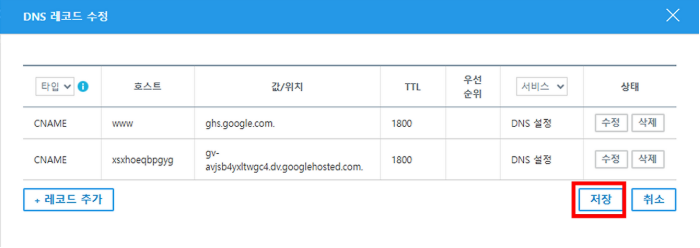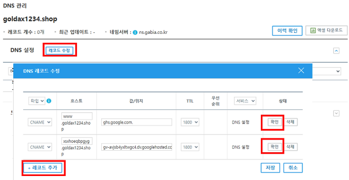 그리고 [레코드 수정] > [레코드 추가 항목을 2개 추가] 후 타입은 CNAME 으로 선택하고,