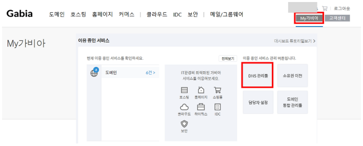 [My가비아] > [DNS 관리툴] 순으로 들어갑니다.