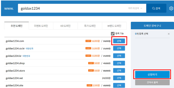 저는 [goldx1234] 라는 키워드로 검색해봤습니다. 아래에 사용가능하다면 [선택] 버튼이 활성화 되고 [신청하기] 버튼을 눌러 구매를 바로 하실 수 있어요