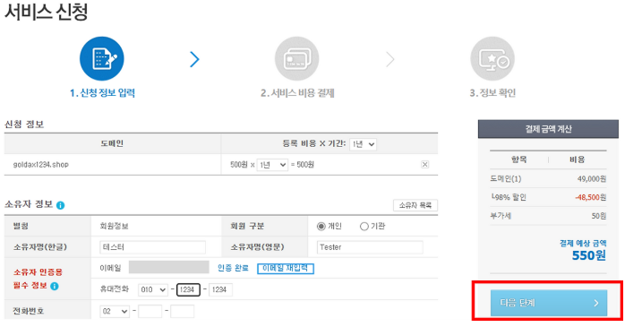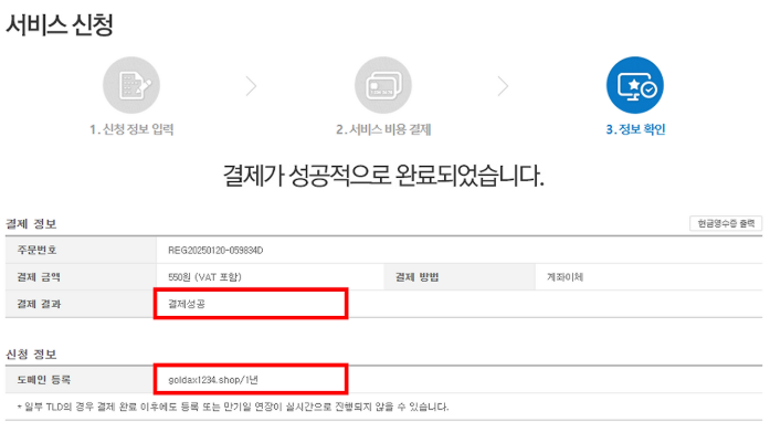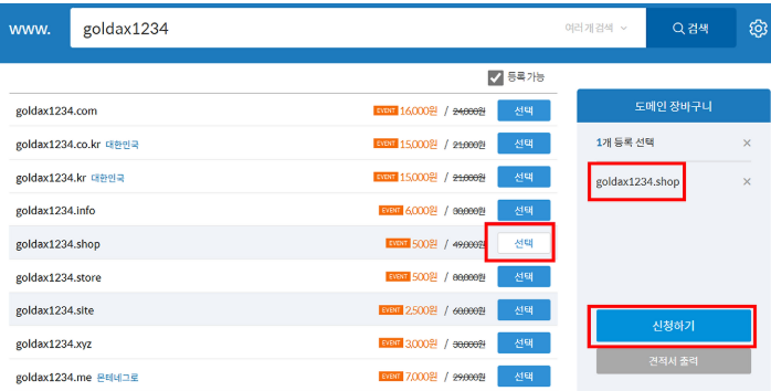 저는 테스트 목적으로 가장 가격 싼 goldax1234.shop 이라는 도메인을 구매해보겠습니다.