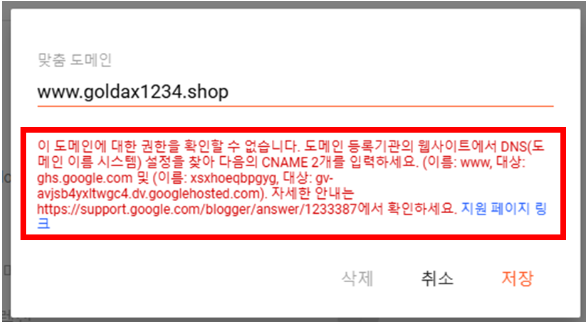 위 가비아 싸이트에서 구매완료한 도메인 앞에 www를 붙여 맞춤 도메인 항목에 [www.goldax1234.shop] 와 같이 입력해줍니다. 그리고 [저장] 버튼을 눌러줍니다.