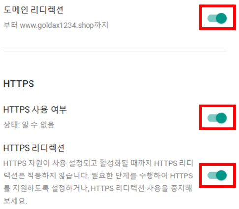 [도메인 리디렉션]과 [HTTPS 사용 여부], [HTTPS 리디렉션]을