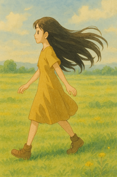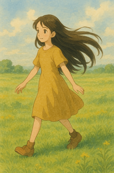 “지브리풍 스타일의 평원 위를 걷는 긴 머리 소녀, 햇살이 따뜻하게 비추는 풍경, 수채화 느낌의 색감”