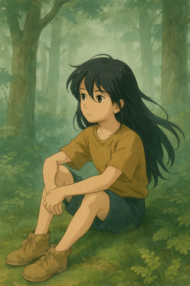 “지브리풍 스타일의 숲속에 앉아 있는 긴 흑발의 소년, 안개 낀 배경, 부드러운 색감”