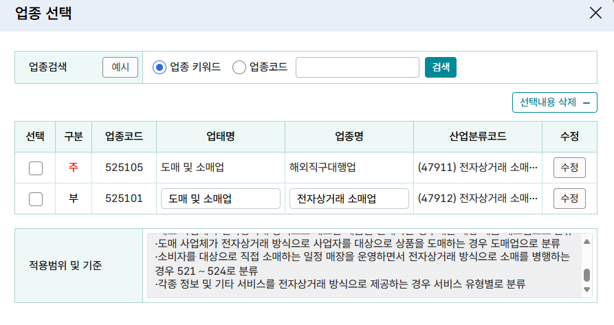 그리고 연달아서 525101(전자상거래 소매업)이라는 코드도 선택해서 부사업으로 선택하였습니다.